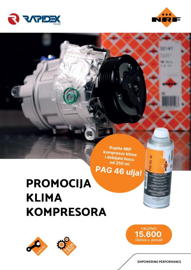 U okviru aktuelne akcije, uz kupovinu NRF kompresora klime ostvarujete pravo na poklon – bocu PAG 46 ulja (250 ml).